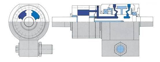 VMC系列扭矩加载器由一个液压摆动液压缸和一个旋转接头组成。液压摆动缸依据旋转叶轮原理制成,液压旋转接头的作用是将液压介质传递到旋转的液压摆动缸内。液压介质驱动叶片产生扭矩角,同时也具有润滑和冷却的作用。