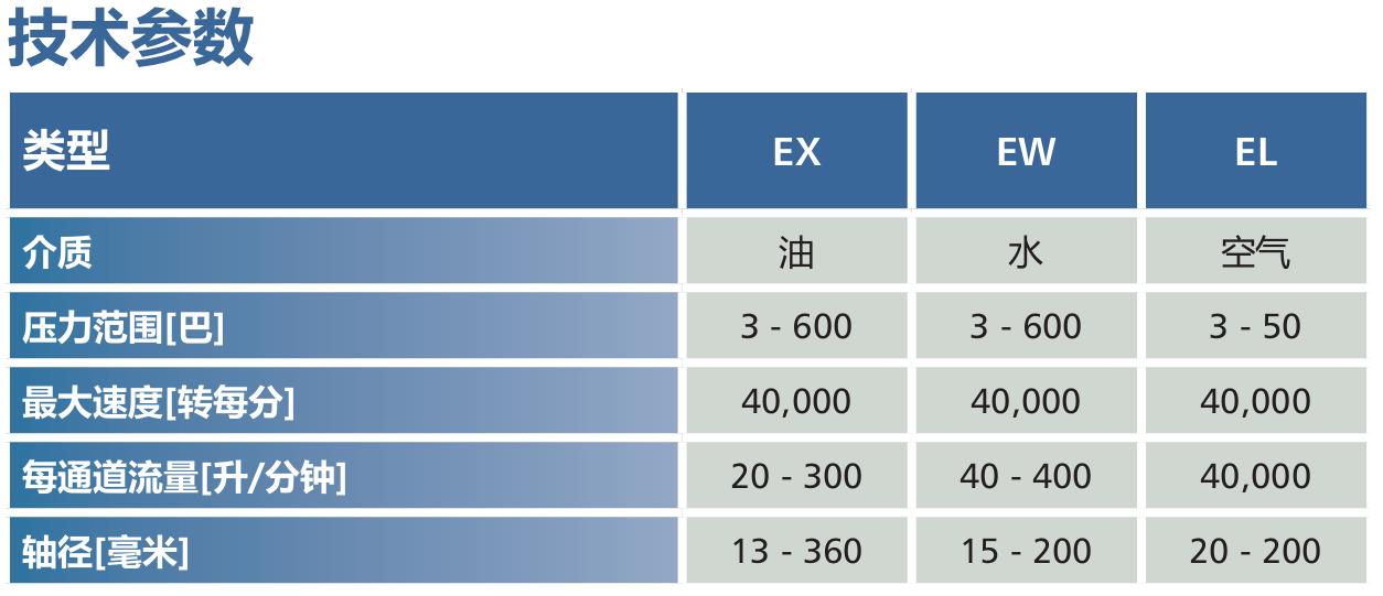 ROTOSTAT®E系列由配备自定心密封套管的无磨损静压调节式径向间隙密封系统组成。基于已获得专利的密封原理,使之在高压、高速工作环境下实现可靠运转。初级和次级密封段内的关键负载区提供有耐磨涂层,并已按照最高表面质量标准进行抛光处理,达到可能的最大可靠性。系统内固有的微量泄漏可以预先计算,可利用密封衬套原理峰值机械腐蚀。 ROTOSTAT®E系列产品可用于同时要求600bar超高压力与高速运转速度的任何工作环境,这种传输油、水、空气的旋转接头用于液压卡紧机构、变桨系统、推料离心机、卷曲及开卷机等。